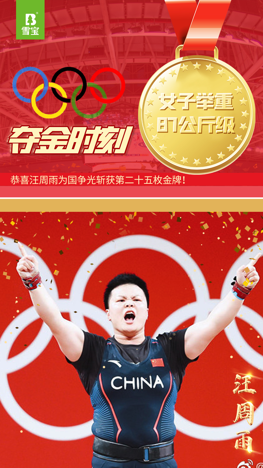 板材十大品牌雪寶祝汪周雨獲得舉重女子87公斤級(jí)冠軍 在舉重女子87公斤級(jí)決賽中,中國選手汪周雨奪得金牌!這是中國代表團(tuán)本屆奧運(yùn)會(huì)第25枚金牌,也是中國舉重隊(duì)本屆奧運(yùn)會(huì)第6枚金牌...