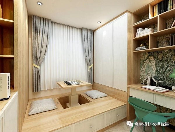 書房不僅可以藏書讀書,還可以娛樂洽談。金秋玉錦板材為主色構(gòu)成的榻榻米和連體書桌,給人帶來溫暖的感覺。或在書桌前體會讀書的樂趣,或在榻榻米上面下盤棋、品杯茶,一同享受美好時光。