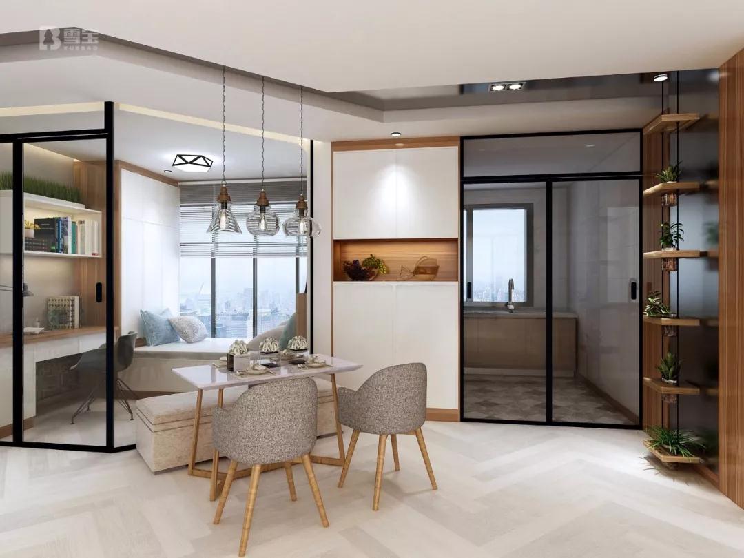 因原戶型廚房面積有限以及不大使用的開(kāi)放式廚房設(shè)計(jì)可能對(duì)家居生活會(huì)造成一定弊端,設(shè)計(jì)師通過(guò)加大廚房空間并改造成封閉式廚房,充分?jǐn)U容和滿足了廚房空間功能屬性,三口之家盡享溫馨居家時(shí)光。餐廳依榻榻米智控鋼化玻璃隔斷設(shè)計(jì)擺放,空間利用恰到好處!