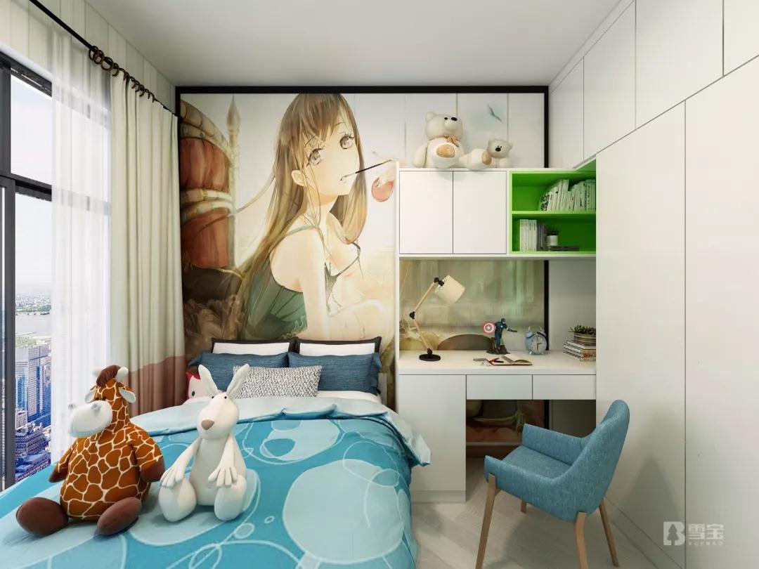充分結(jié)合七歲孩子的喜好,墻面衣柜與書(shū)柜、書(shū)桌完美組合,收納和學(xué)習(xí)兼顧。雪寶炫彩板綠野仙蹤花色在以白色色系為主體的組合柜中脫穎而出,動(dòng)漫墻畫(huà)、卡通布偶,以及色系搭配,都讓整個(gè)空間散發(fā)出清新自然和滿滿活力感。