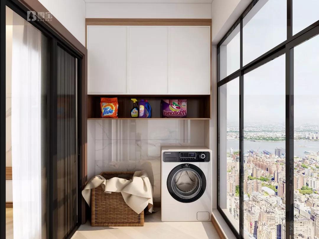 陽(yáng)臺(tái)風(fēng)格及裝飾搭配與戶型整體風(fēng)格相輔相成,陽(yáng)臺(tái)柜上方柜體滿足日常收納,下方鏤空為洗衣機(jī)和收納筐置一席之地。綠植裝扮盡顯盎然綠意,落地窗設(shè)計(jì)盡覽城市風(fēng)景。