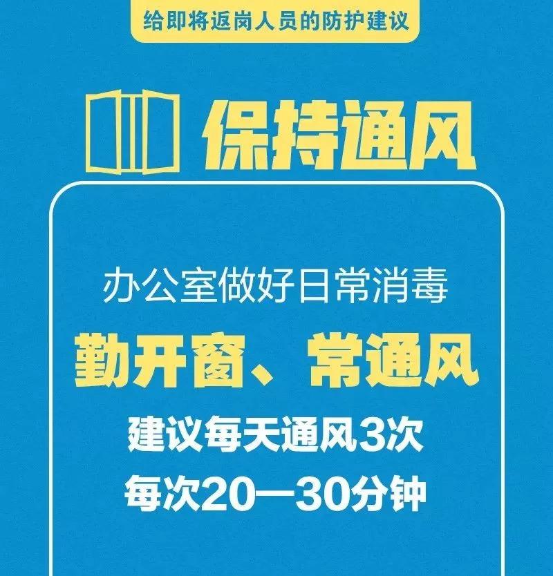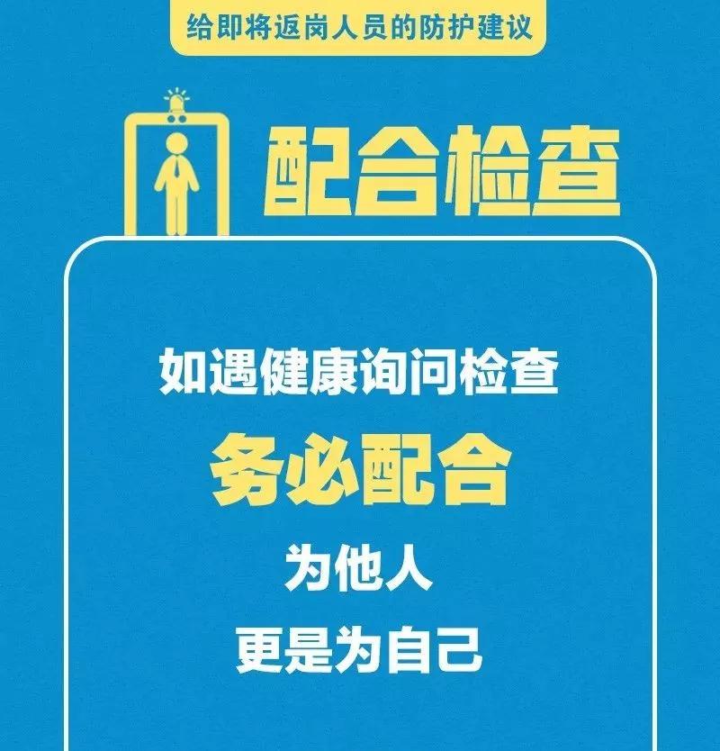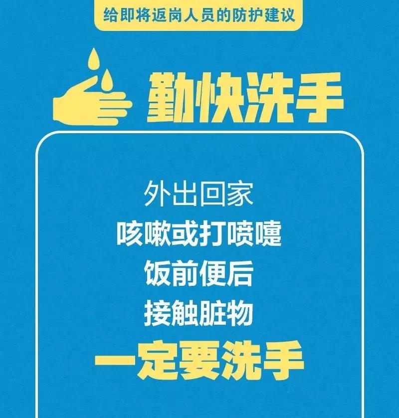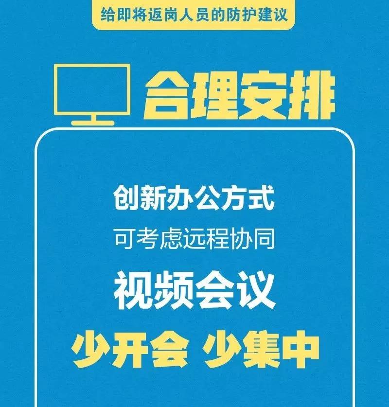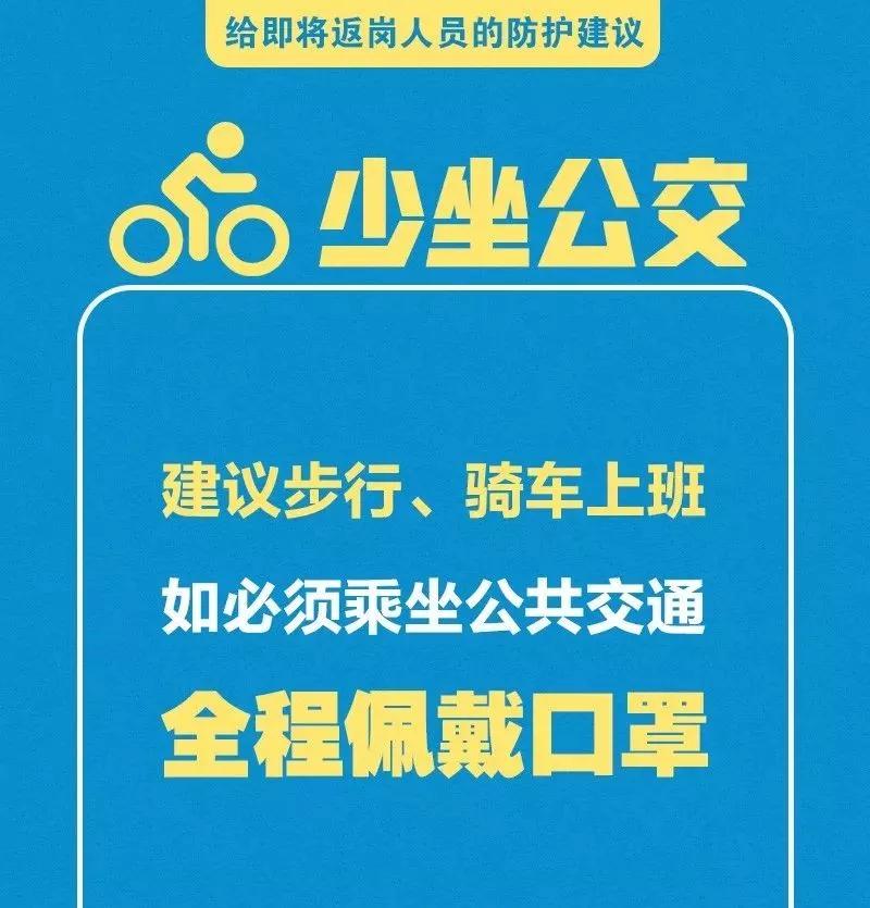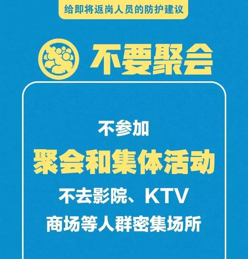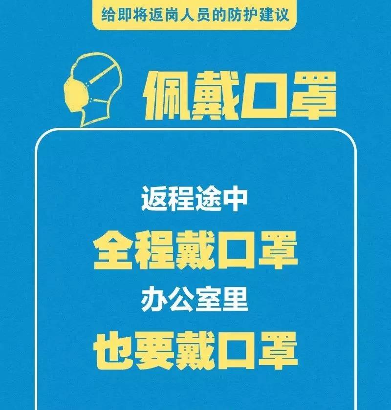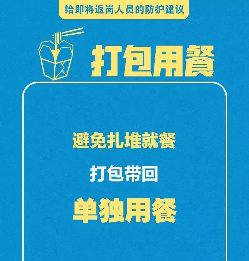 春節(jié)假期已經(jīng)進入尾聲,各地政府陸續(xù)出臺復(fù)工延后的政策,但是對于有些人員因一系列原因不得不提前返回工作崗位的您來說,疫情防控仍不能松懈,少開會、少集中,佩戴口罩、打包用餐……這些返崗防護建議您一定用得著,請牢記!