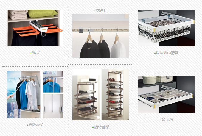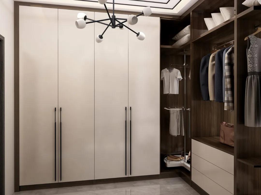 懸掛區(qū)設(shè)計,掛桿、掛褲架、衣通桿、升降衣架等,讓整個衣帽間功能和實用性大大提升。疊放區(qū)設(shè)計,抽屜、襯板、拉籃等,也能做到衣帽間收放整齊、熠熠生輝。同樣,旋轉(zhuǎn)鞋架、多寶箱等功能五金可以最大程度地節(jié)約空間。