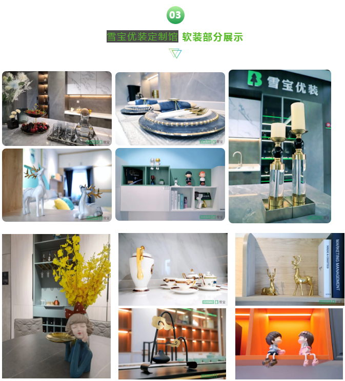雪寶優(yōu)裝定制館在硬裝方面的表現(xiàn)已然精彩紛呈,無論是精湛的技術(shù)工藝呈現(xiàn)出藝術(shù)的產(chǎn)品,亦或細(xì)節(jié)處的精雕細(xì)琢,無不體現(xiàn)出雪寶人的匠心匠材。在軟裝搭配方面更是相得益彰,恰到好處。