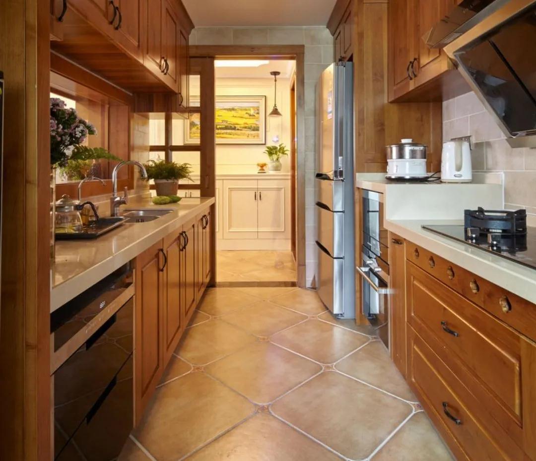 也叫雙一字型廚房,是最高效的廚房布局,最大化分配廚具和操作臺(tái)的空間,廚房長而窄,兩側(cè)都有空間,在走廊一側(cè)空間足夠的話,還可以設(shè)計(jì)一個(gè)溫馨小餐廳。
