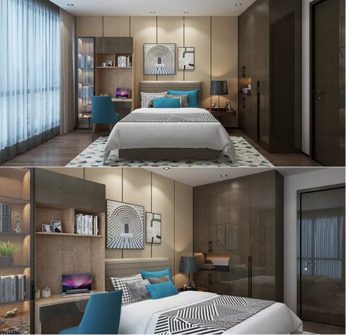 次臥設(shè)計增加了書柜書桌組合,滿足工作學(xué)習(xí)及休息的私人時光。
