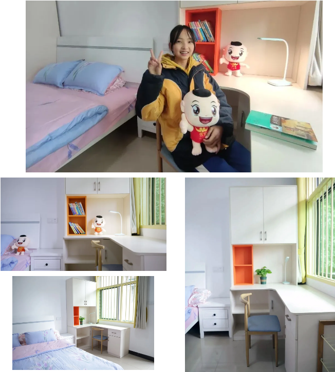 經(jīng)過(guò)徹底的全面翻新裝修后,房間墻面煥然一新,地磚鋪設(shè)整潔通透,全新的實(shí)木床旁立著由使用“雪寶板材兒童房健康板”打造而成的大衣柜和書(shū)桌柜,陽(yáng)光透過(guò)米棕色的窗簾照亮房間,溫暖明亮,整個(gè)小屋發(fā)生翻天覆地的變化。于團(tuán)團(tuán)希望小屋改造的家庭孩子悅悅而言,她開(kāi)心的坐在新書(shū)桌前笑了。