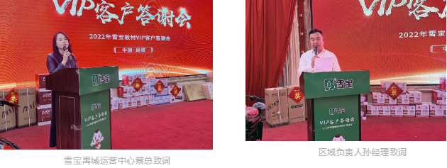 答謝會上,蔡總發(fā)表熱情洋溢的致辭,對蒞臨現(xiàn)場的嘉賓致以熱烈歡迎和由衷的感謝,表示:“雪寶作為兒童房健康板環(huán)保先河的開啟者、踐行者,以聚焦兒童健康家居為企業(yè)使命,贏得了市場的認可,獲得了廣大消費者的盛情贊譽!作為山東禹城運營中心的負責人,非常榮幸與大家一起將熱愛的事業(yè)堅持不懈,讓我們再接再厲再創(chuàng)輝煌!”