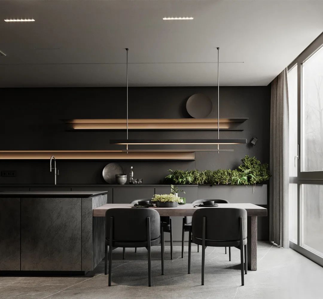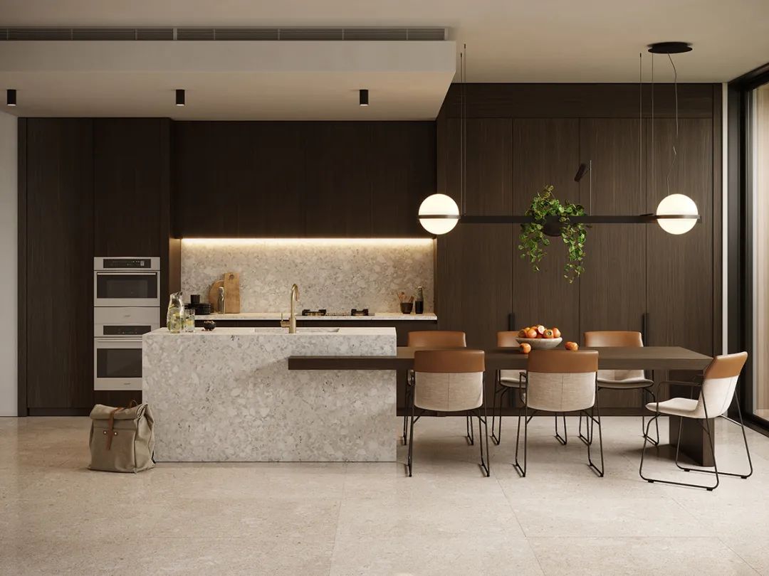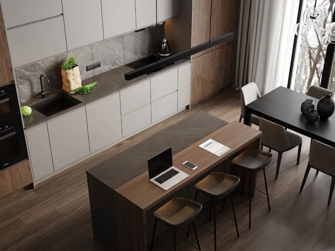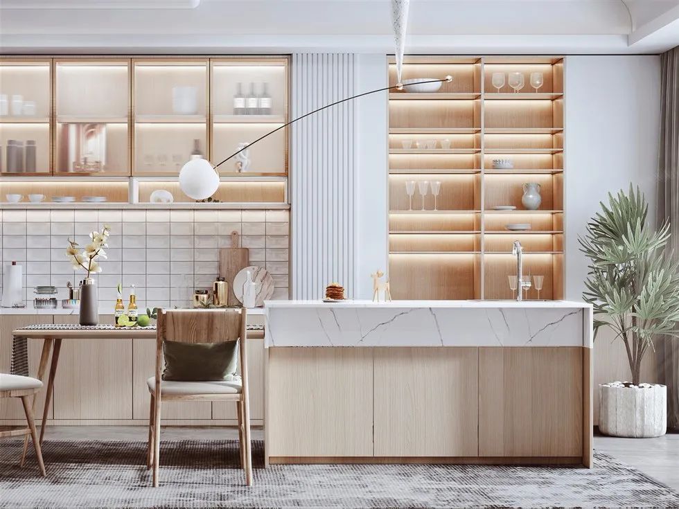 靠廚房設(shè)計(jì)為大理石或巖板,另外一邊設(shè)計(jì)為餐桌,這種設(shè)計(jì)動(dòng)線也十分流暢。大理石或巖板可以放洗好的菜和碗碟,另一邊可直接吃飯,這種空間少了隔墻隔斷,也會(huì)顯得更加開(kāi)闊明亮。