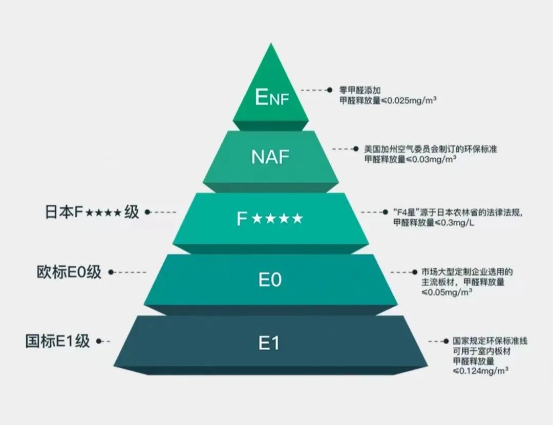 該標(biāo)準(zhǔn)將室內(nèi)用人造板及其制品的甲醛釋放量按照限量值分為3個(gè)等級(jí),即E1級(jí)(≤0.124mg/m³)、E0級(jí)(≤0.050mg/m³)和ENF級(jí)(≤0.025mg/m³)。新國標(biāo)ENF級(jí)成為了全球人造板行業(yè)最嚴(yán)苛的環(huán)保等級(jí)標(biāo)準(zhǔn),規(guī)定甲醛釋放量數(shù)值超過歐美、日本環(huán)保標(biāo)準(zhǔn)。