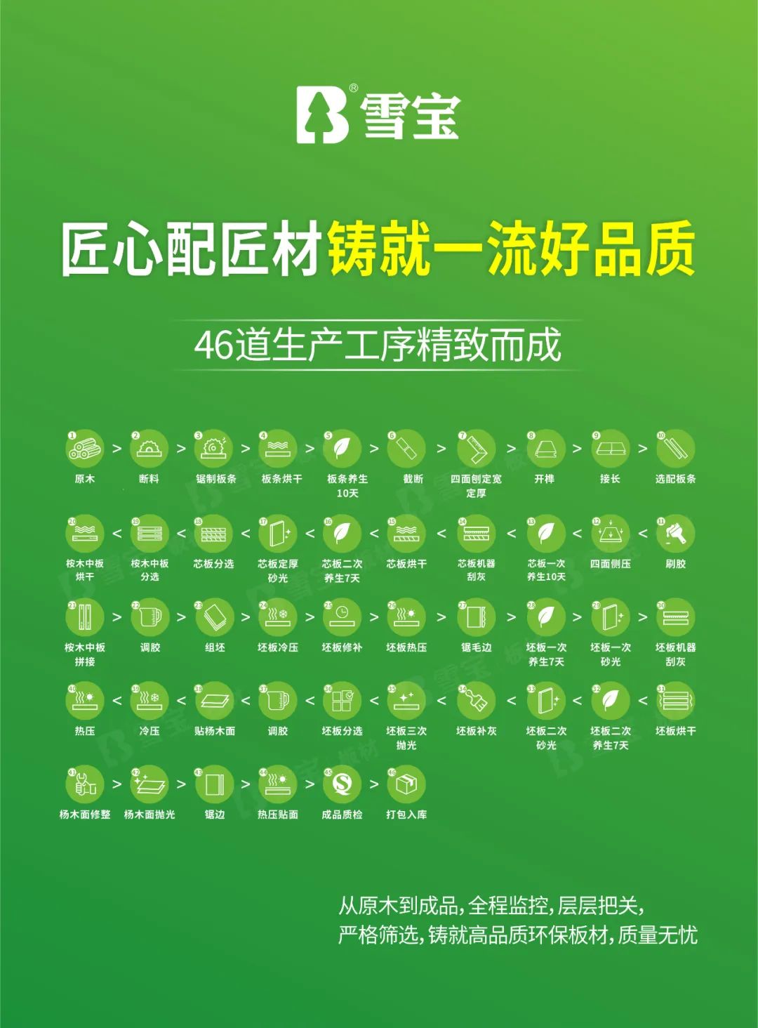 從甄選更優(yōu)質(zhì)的實(shí)木原材以確保基材更優(yōu)異,到建立嚴(yán)苛的生產(chǎn)工藝標(biāo)準(zhǔn)以保障品質(zhì)更卓越,以及添加無醛的環(huán)保植物大豆膠黏合,雪寶從根本上杜絕甲醛、苯酚等有毒和有害物質(zhì)的釋放。