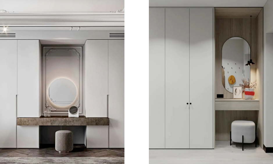 對于愛美的女士來說,除了想擁有一個大大的衣柜,可以放下想買衣服,當(dāng)然也希望有一個梳妝臺。衣柜連接梳妝臺則完美解決這個問題,整體空間充分利用,梳妝、收納兩不誤。