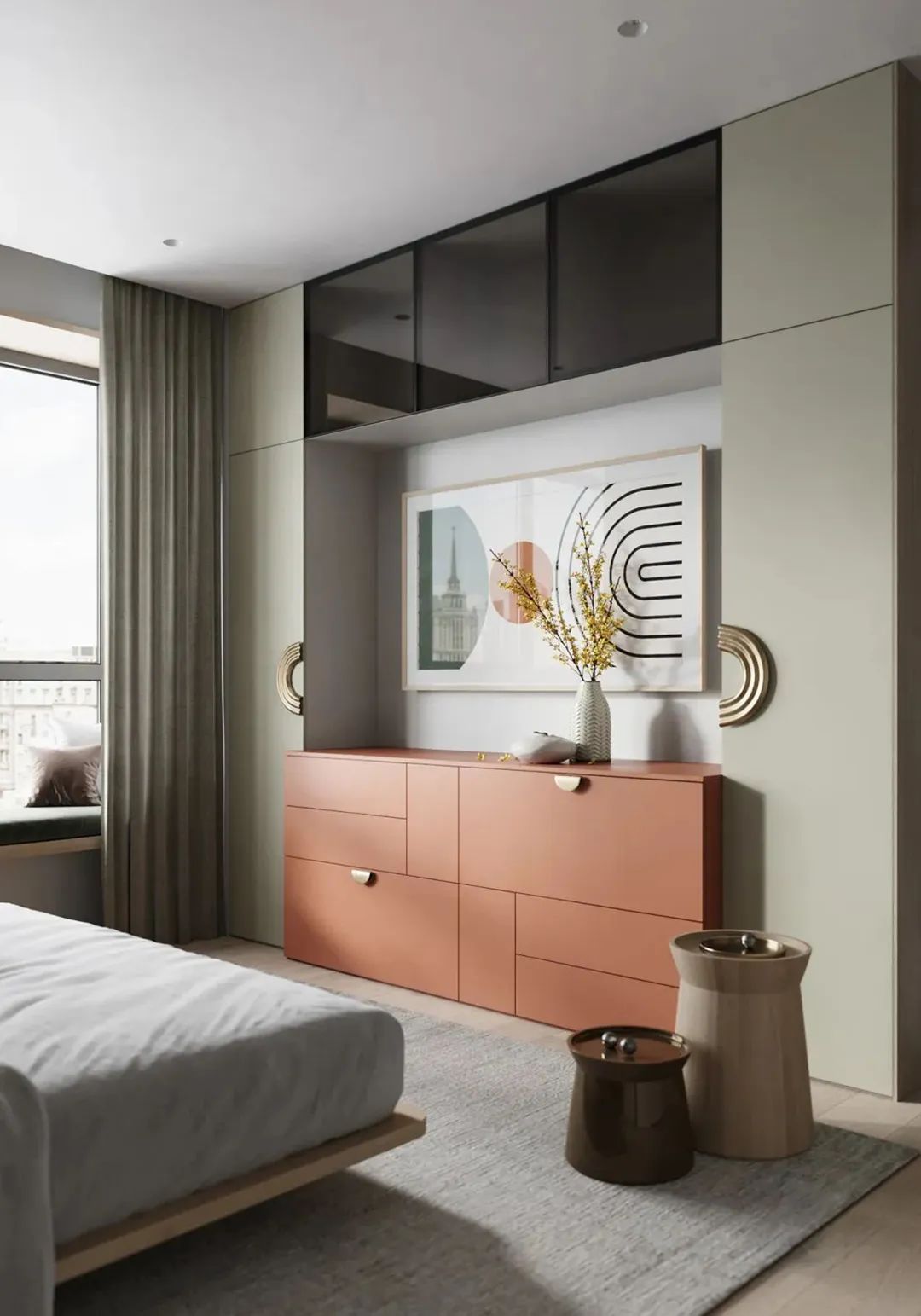 一直以來床頭柜因?yàn)樗墓τ枚嬖,不妨試試一體化的床+床頭柜+衣柜。不僅解決了搭配床頭柜難的問題,也減少了臥室的衛(wèi)生死角,讓休息區(qū)更為干凈整潔通透。