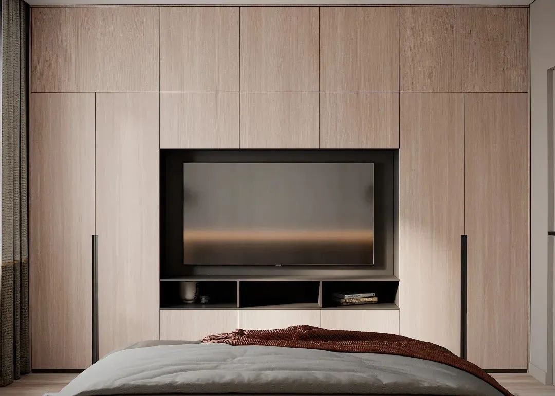 有的業(yè)主會選擇將電視搬進(jìn)臥室,將電視柜與定制衣柜進(jìn)行組合設(shè)計(jì),既能滿足日常休閑需求,還能解決物品收納的問題,一舉兩得。