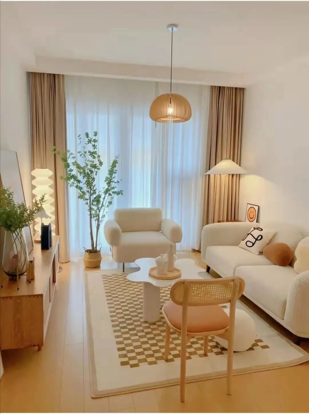 材質(zhì)方面為了符合奶油系風(fēng)格的調(diào)性,材質(zhì)上要選擇比較有肌理感的,像羔羊絨、棉麻、原木等材質(zhì)都很合適。