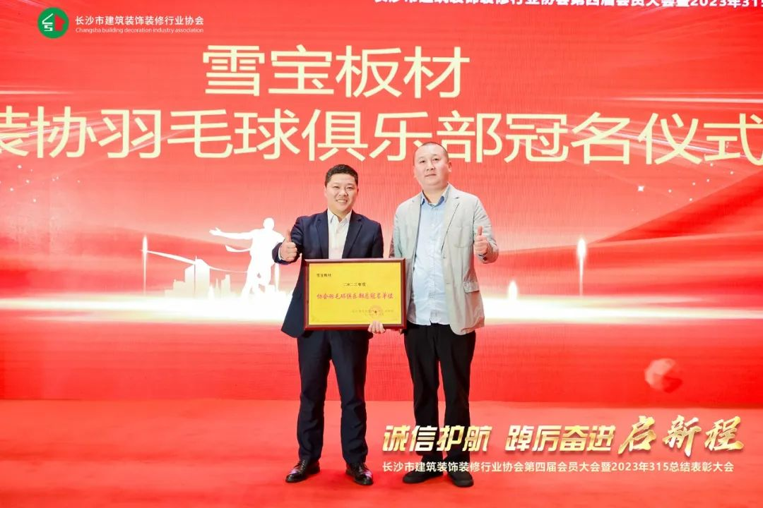 會議現(xiàn)場,雪寶板材與長沙市建筑裝飾裝修行業(yè)協(xié)會達成簽約合作,成為協(xié)會羽毛球俱樂部冠名單位,并榮獲“2022年度優(yōu)秀材料服務(wù)企業(yè)”,攜手為本土建筑裝飾裝修行業(yè)創(chuàng)新發(fā)展及締造美好人居環(huán)境提供高品質(zhì)保障。