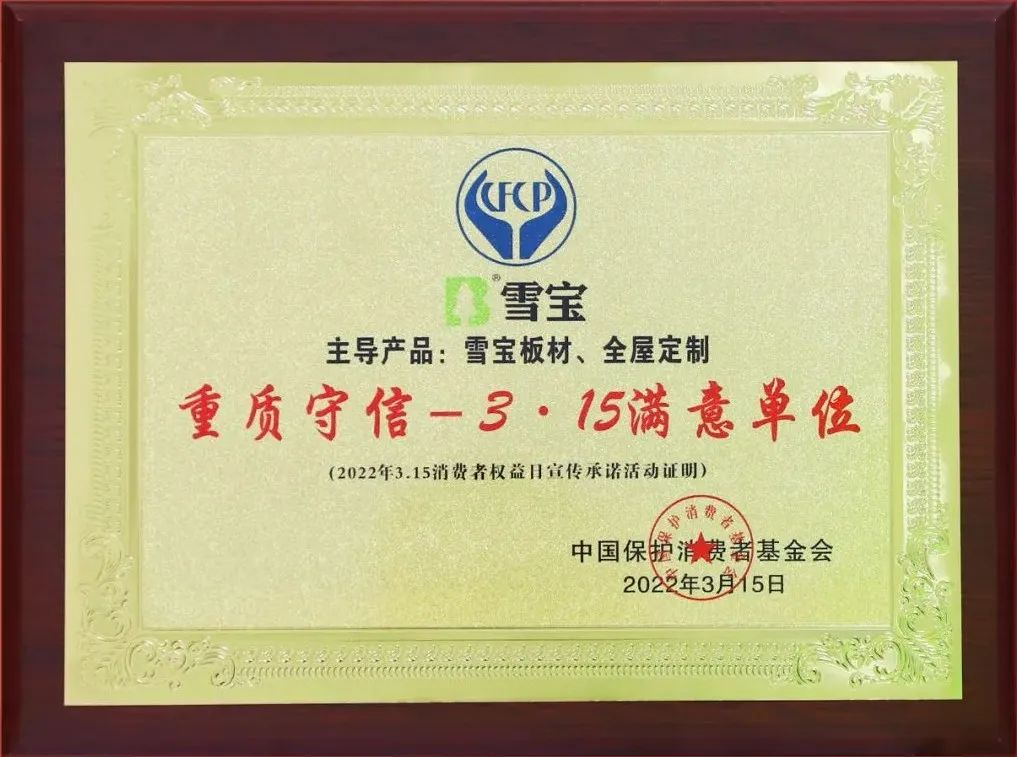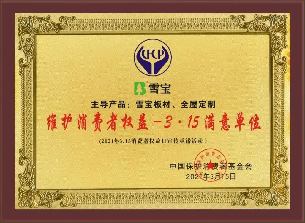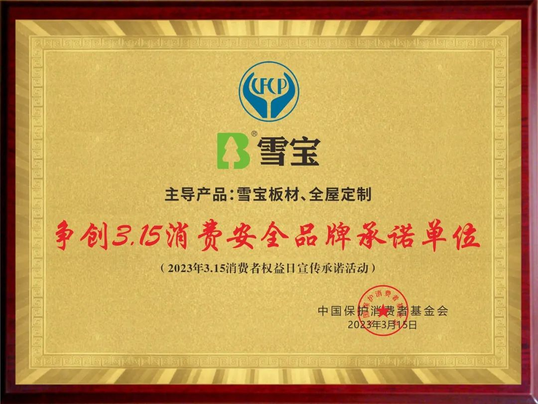 經(jīng)過(guò)多輪嚴(yán)格的評(píng)審與篩選,雪寶家居集團(tuán)有限公司主導(dǎo)產(chǎn)品雪寶板材、全屋定制品類以優(yōu)異的產(chǎn)品品質(zhì)和良好的消費(fèi)口碑,被中國(guó)保護(hù)消費(fèi)者基金會(huì)授予“爭(zhēng)創(chuàng)3•15消費(fèi)安全品牌承諾單位”!
