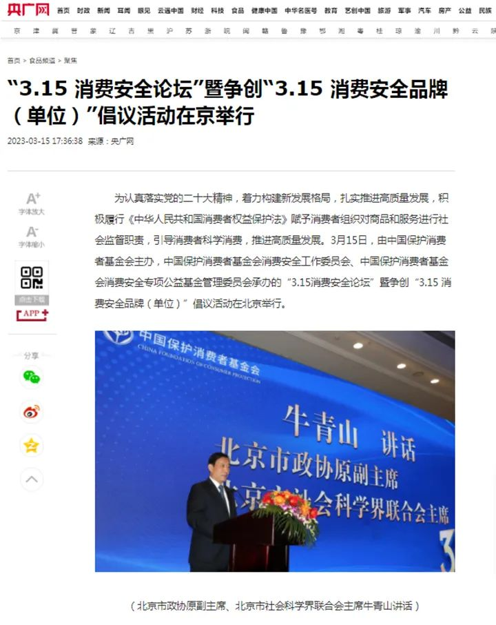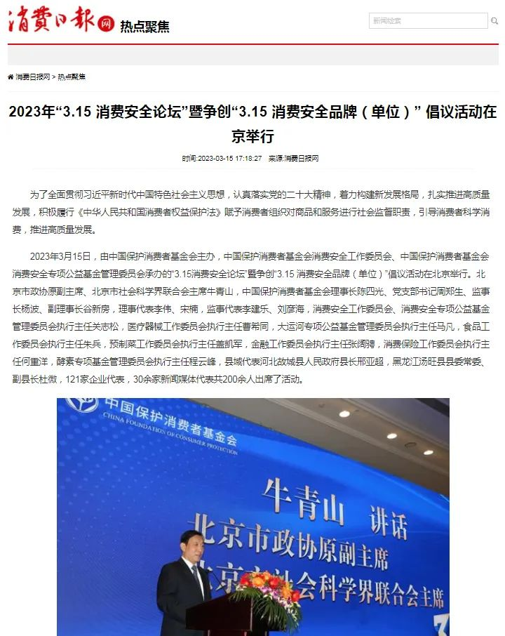 2023年3月15日,由中國(guó)保護(hù)消費(fèi)者基金會(huì)主辦,中國(guó)保護(hù)消費(fèi)者基金會(huì)消費(fèi)安全工作委員會(huì)、中國(guó)保護(hù)消費(fèi)者基金會(huì)消費(fèi)安全專項(xiàng)公益基金管理委員會(huì)承辦的“3.15消費(fèi)安全論壇”暨爭(zhēng)創(chuàng)“3.15 消費(fèi)安全品牌(單位)”倡議活動(dòng)在北京舉行。雪寶受邀出席,并被授予“爭(zhēng)創(chuàng)3•15消費(fèi)安全品牌承諾單位”!