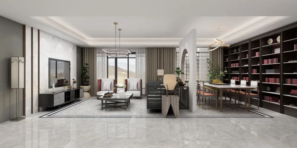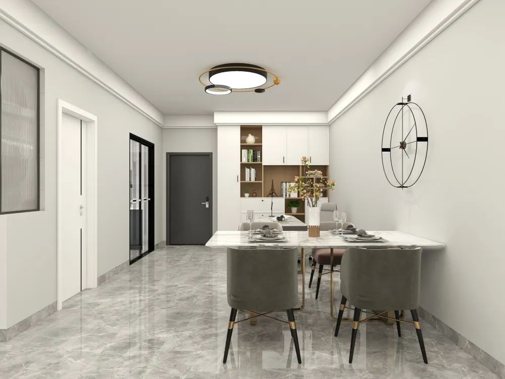 如果客廳和餐廳中間是走廊過道,可以利用地面瓷磚的鋪貼方式來劃分出客廳和餐廳,對地面瓷磚做邊線造型設(shè)計,既能劃分出空間,同時又起到了很好的裝飾效果。