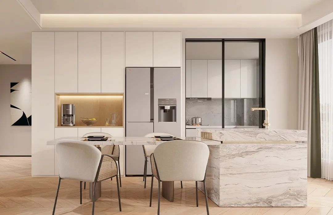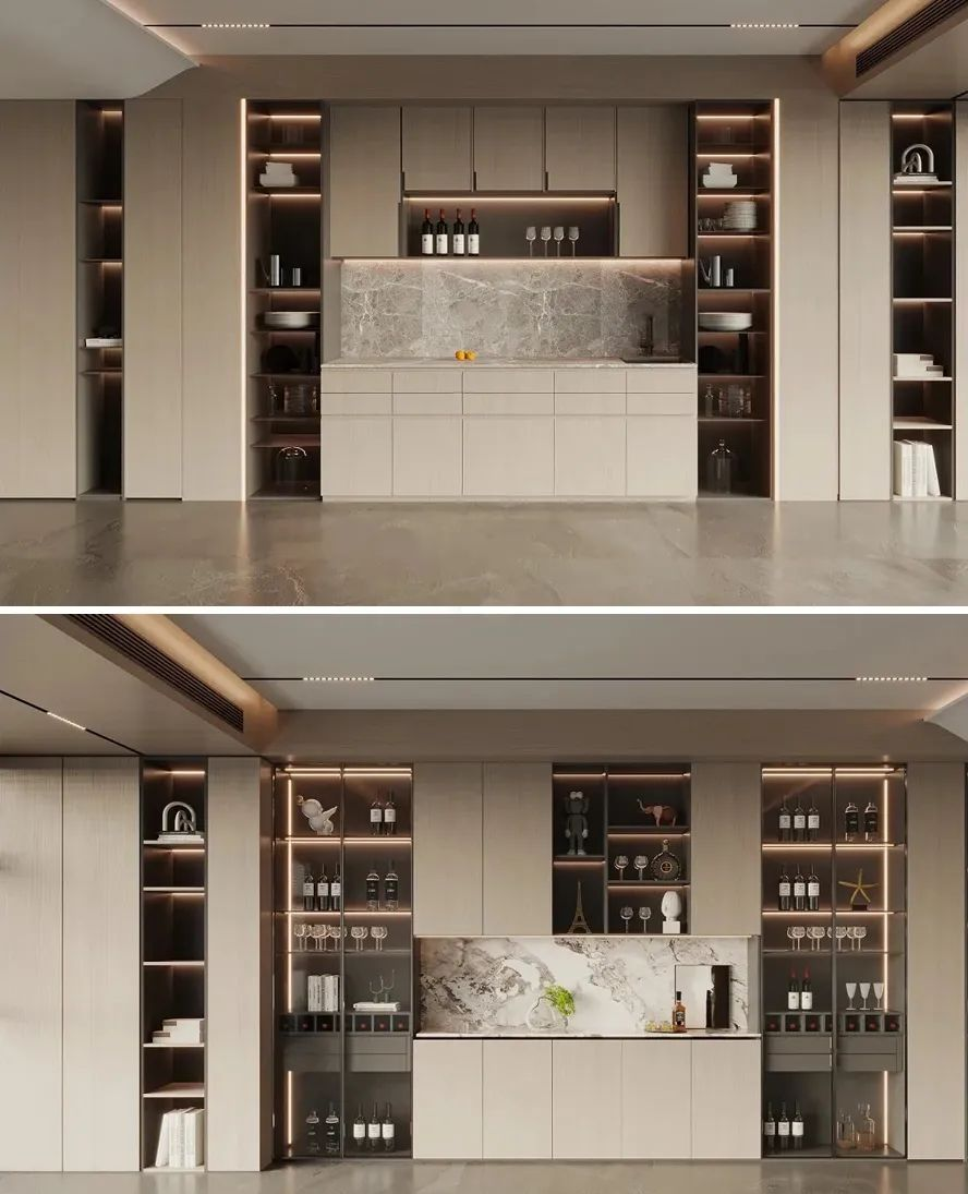 當餐廳面積太小,又想要做餐邊柜怎么辦?高顏值的嵌入式餐邊柜就是很好的選擇!嵌入式的餐邊柜可以完美地融入整體設計,輕松擴容,避免占用過多的空間,同時視覺上更為通透和諧,沒有龐然大物的突兀之感。