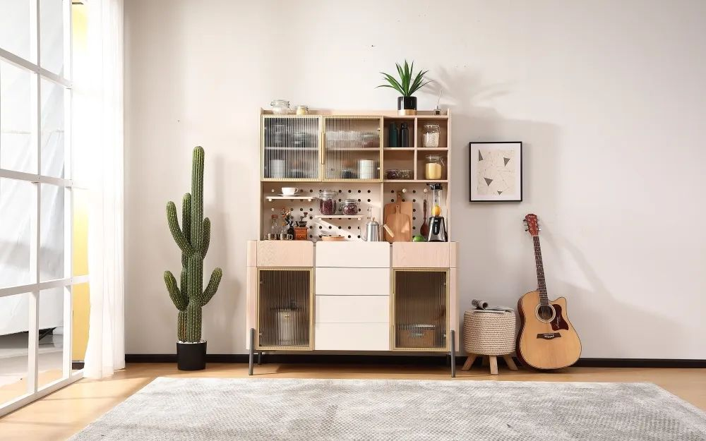 餐邊柜可以提供強(qiáng)大的收納功能,像廚具、餐具、一次性水杯、茶具、零食等等大小物品,都可以收納在餐邊柜里面,避免家里到處都是雜物亂擺的情況。