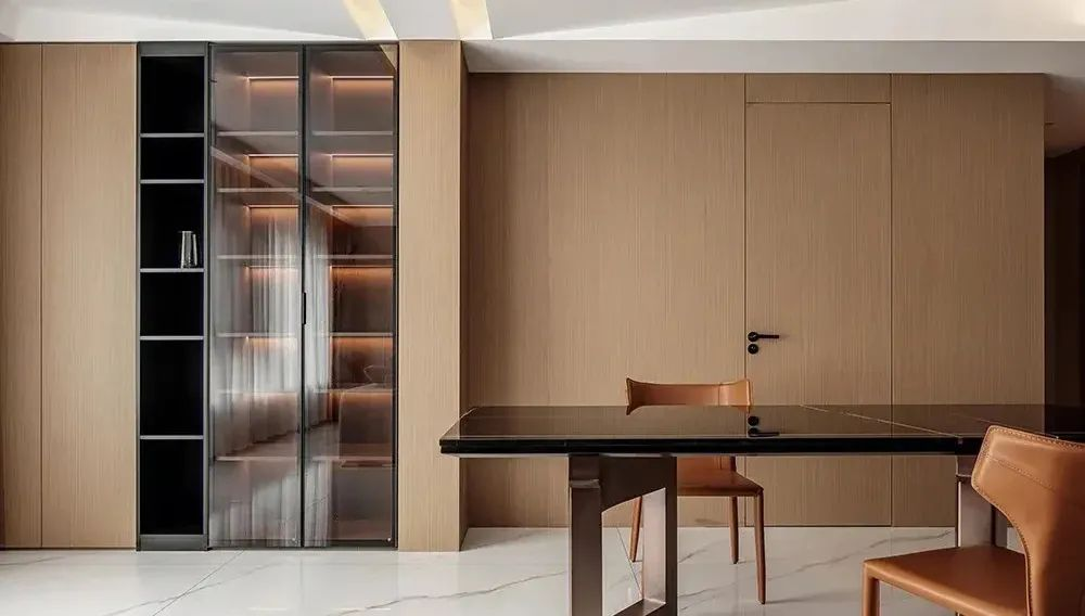 金屬框玻璃門板營(yíng)造的輕奢空間氛圍,讓高級(jí)感融入生活。磨砂質(zhì)感或是茶色玻璃柜門,朦朧模糊的鏡面,無(wú)形中增添了空間的藝術(shù)美感。