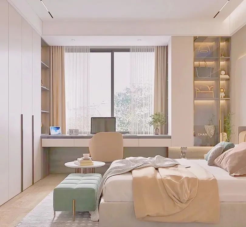將衣柜與窗戶結(jié)合,設(shè)計(jì)飄窗一體柜,能夠在有限的空間內(nèi)實(shí)現(xiàn)最大的儲(chǔ)物功能,對(duì)于小戶型臥室十分友好!