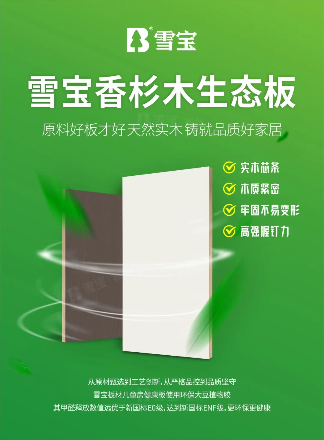 不做醛材,只做高品質(zhì)環(huán)保板材!作為行業(yè)先行創(chuàng)建兒童房健康板高品質(zhì)標(biāo)準(zhǔn)的雪寶板材,無(wú)論選材、工藝、品質(zhì)、服務(wù)、口碑等諸多方面,都有著絕對(duì)優(yōu)勢(shì)和傲人成績(jī)!