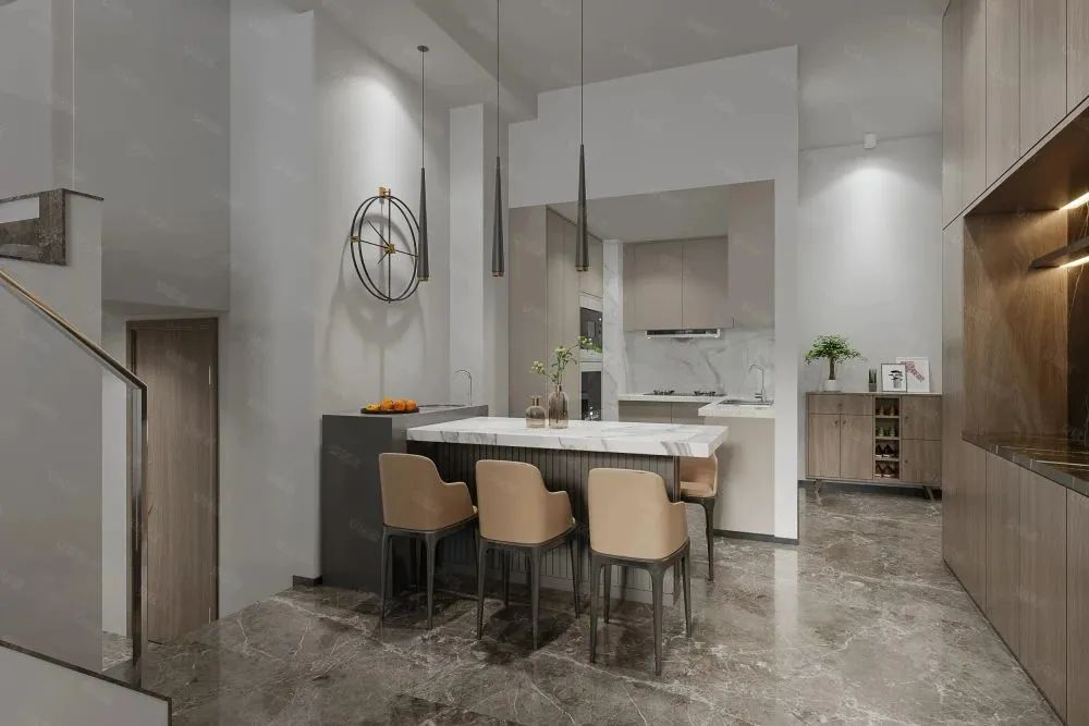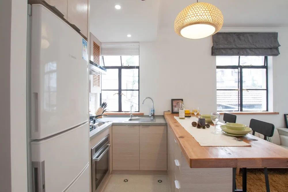 在油煙已經(jīng)不成問(wèn)題的今天,開放式的廚房采光更足,跟家人溝通也更方便。唯一不好的一點(diǎn)是廚房容易跟客廳混成一塊,總有種在客廳做飯的錯(cuò)覺(jué)。這時(shí),在廚房和客廳之間加入一個(gè)吧臺(tái),讓兩者的劃分更明顯,而且吧臺(tái)還能當(dāng)備餐桌,一舉兩得。