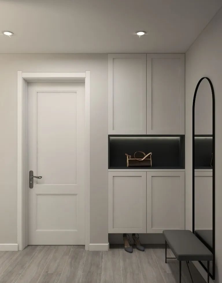門(mén)廳的柜子一般用來(lái)存放臨時(shí)穿的衣服、鞋子以及其他家居生活用品,沒(méi)有把手的收納柜子讓門(mén)廳處更加整潔有序。