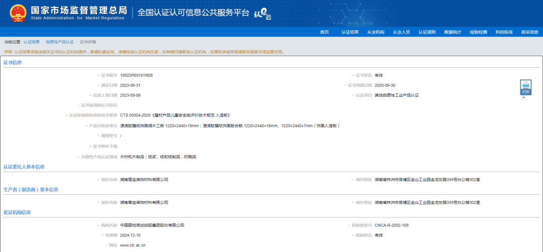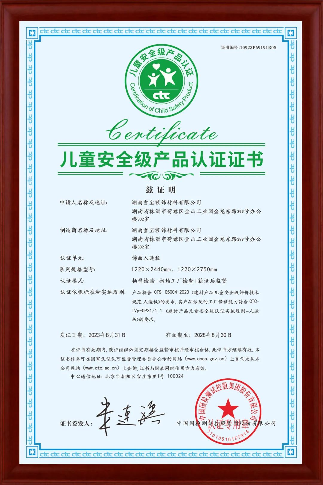 兒童安全級(jí)產(chǎn)品認(rèn)證,以更嚴(yán)苛的環(huán)保標(biāo)準(zhǔn)、更嚴(yán)謹(jǐn)?shù)恼J(rèn)證規(guī)則,旨為保障兒童活動(dòng)場(chǎng)所質(zhì)量及環(huán)境安全健康,也為踐行國(guó)家質(zhì)量強(qiáng)國(guó)戰(zhàn)略、保證兒童健康生活貢獻(xiàn)力量。本次獲得由中國(guó)國(guó)檢測(cè)試控股集團(tuán)股份有限公司(CTC)出具的兒童安全級(jí)產(chǎn)品認(rèn)證證書(shū)顯示:產(chǎn)品符合 CTS 05004-2020《建材產(chǎn)品兒童安全級(jí)評(píng)價(jià)技術(shù)規(guī)范人造板》的要求,進(jìn)一步有力證明了雪寶板材飾面人造板材系列產(chǎn)品的健康和環(huán)保性,同時(shí),雪寶板材產(chǎn)品環(huán)保性、安全性得到國(guó)家官方權(quán)威機(jī)構(gòu)的認(rèn)證,也是對(duì)我們致力拔高行業(yè)的產(chǎn)品環(huán)保水平新高度的認(rèn)可和肯定!