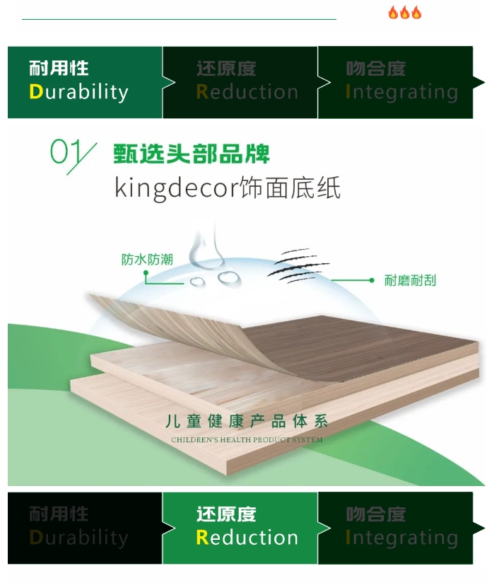 從工藝角度上“德瑞夫”代表著這項工藝的6大特點集合,即耐用性強、還原度高、吻合度好、平整度高、逼真度高、穩(wěn)定性好。一個融合6大工藝和原料的全新獨有行業(yè)首創(chuàng)工藝技術(shù),實現(xiàn)雪寶飾面效果100%還原實木紋理的同時,強調(diào)了雪寶板材優(yōu)異品質(zhì)的獨特性。從文化內(nèi)涵方面而言,“德瑞夫”與雪寶板材的品牌理念如出一轍,將“德瑞夫"與“兒童健康”相結(jié)合,切實為兒童健康成長提供保障。