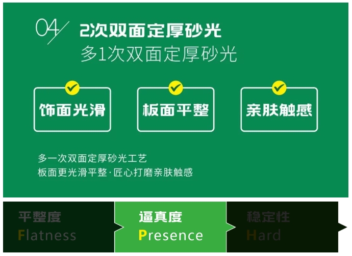 從飾面紙張的耐用性(Durabilityt)、3D印刷技術(shù)實木紋理的還原度(Reduction)、鋼板與飾面紙同步精準對紋壓貼的吻合度(Integrating)、2次雙面定厚砂光板面的平整度(Flatness)、4+1色印刷技術(shù)的飾面效果逼真度(Presence)、進口艾克洛油墨工藝締造10年色澤如新的穩(wěn)定性(Hard)6個維度創(chuàng)造,100%還原實木紋理。