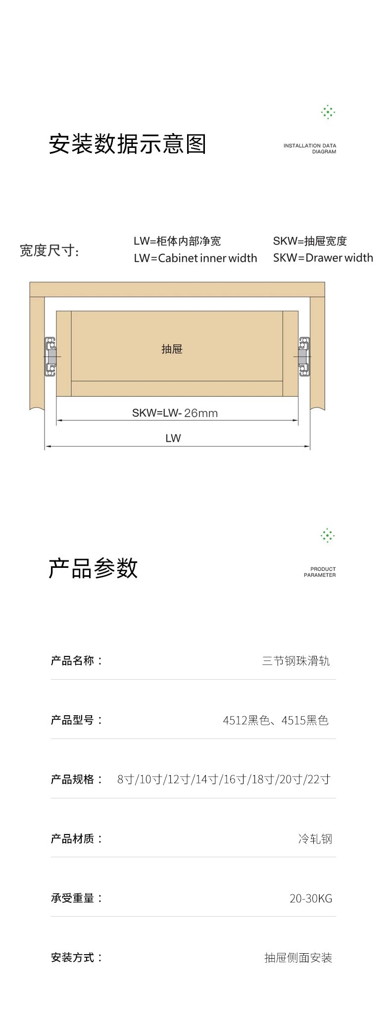 抽屜在家具中的使用很關(guān)鍵,對(duì)于抽屜而言,滑軌就是抽屜的“心臟”。于家居收納中有著無與倫比的作用,讓空間在無序中建立有序。而抽屜的使用體驗(yàn),絕大程度上取決于滑軌。開合是否能順滑、能抽拉到什么程度、承重如何、會(huì)不會(huì)翻傾等問題,都跟滑軌有關(guān)系,因此選擇一個(gè)品質(zhì)好的滑軌很重要。雪寶4512黑色鋼珠三節(jié)滑軌,精工設(shè)計(jì),內(nèi)置鋼珠,穩(wěn)定性強(qiáng),全程順滑到底。三節(jié)全拉出設(shè)計(jì),抽屜空間一覽無余,物品收納整齊有序,取物更輕松。表面電鍍工藝,抗腐蝕,耐磨損,久用如新,無需頻繁更換。苛求品質(zhì)細(xì)節(jié),讓每一次推拉都是一種享受!