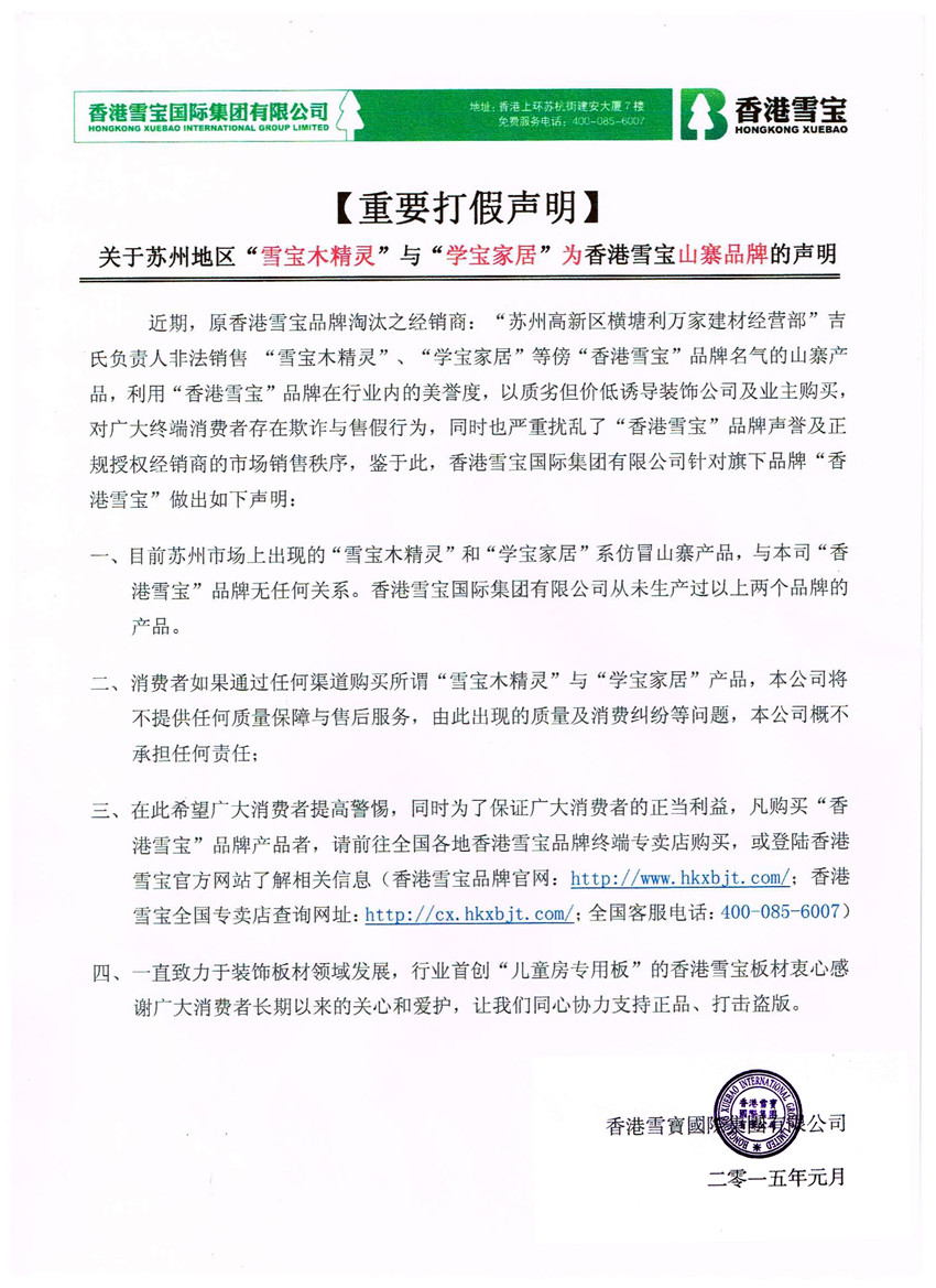 一、目前蘇州市場上出現(xiàn)的“雪寶木精靈”和“學寶家居”系仿冒山寨產(chǎn)品,與本司“雪寶”品牌無任何關系。雪寶集團有限公司從未生產(chǎn)過以上兩個品牌的產(chǎn)品。