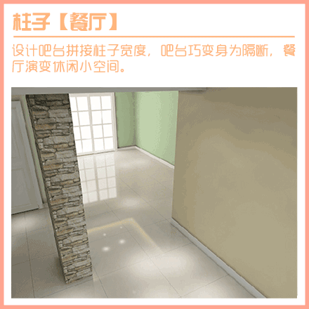 【4、柱子·餐廳】設計吧臺拼接柱子寬度,吧臺巧變身為隔斷,餐廳演變休閑小空間。