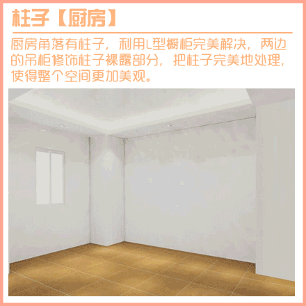 【5、柱子·廚房】廚房角落有柱子,利用L型櫥柜完美解決,兩邊的吊柜修飾柱子裸露部分,把柱子完美地處理,使得整個空間更加美觀。