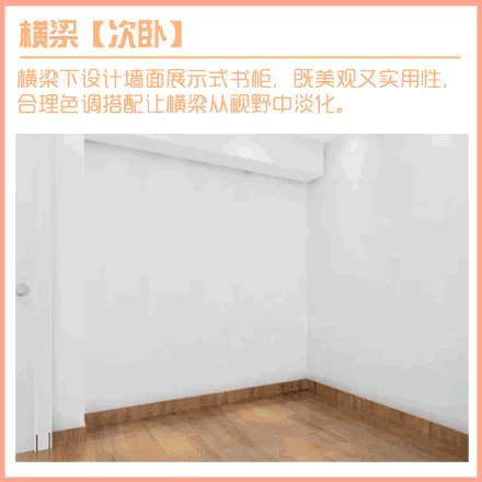 【7、柱子·次臥】橫梁下設計墻面展示式書柜,既美觀又實用性,合理色調(diào)搭配讓橫梁從視野中淡化。