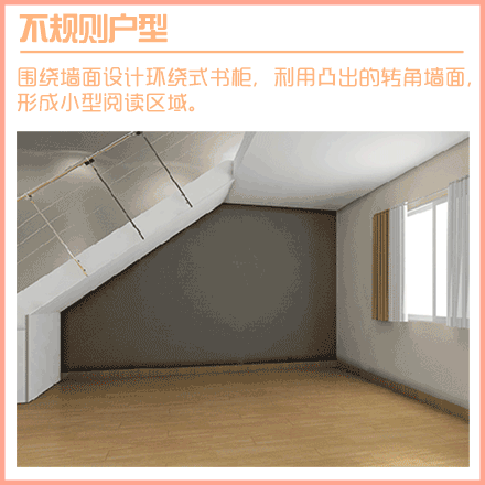【9、不規(guī)則戶型】圍繞墻面設計環(huán)繞式書柜,利用凸出的轉角墻面,形成小型閱讀區(qū)域。