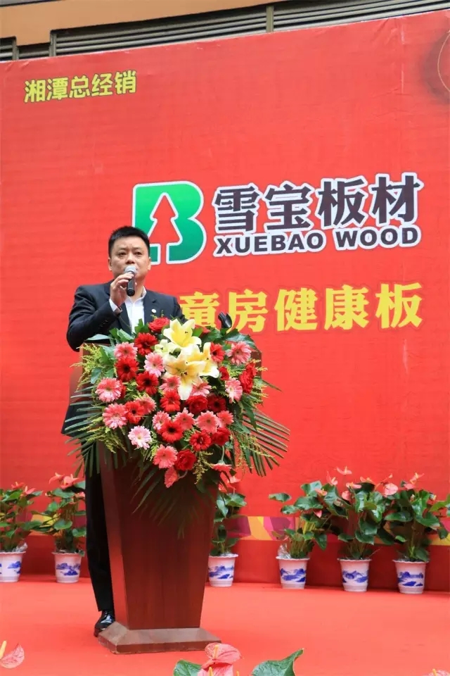 ▲雪寶板材湘潭旗艦店總經(jīng)理劉輝群女士為開(kāi)業(yè)典禮致辭