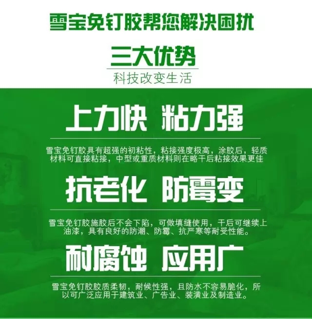 雪寶免釘膠是高端技術(shù)新產(chǎn)品,具有超強(qiáng)粘合力、抗老化、防龜裂、免鉆孔、無釘眼、不損害基材、操作方便、節(jié)時(shí)省量等突破性功能,產(chǎn)品在施工過程中快捷、完美的品質(zhì)表現(xiàn),更符合了現(xiàn)代人的高標(biāo)準(zhǔn)要求,削減了繁瑣的鉆孔、打釘?shù)仁┕み^程,有效地提高工作效率及節(jié)約施工成本,其極高的性價(jià)比深受消費(fèi)者青睞。
