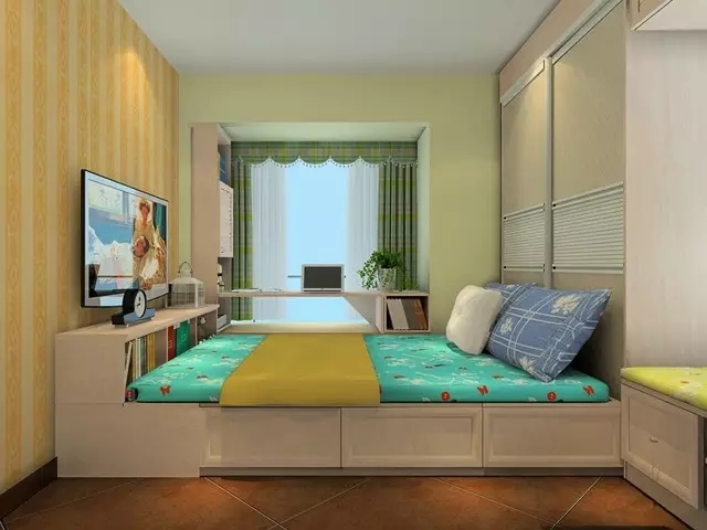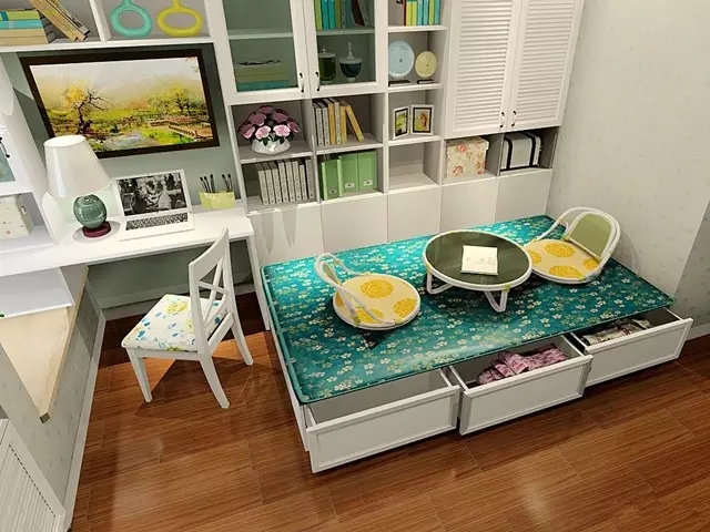 ①沿著窗周打造一個(gè)榻榻米型儲(chǔ)物柜,榻榻米底部360度收納,可分為常用和不常用物件收納區(qū)。