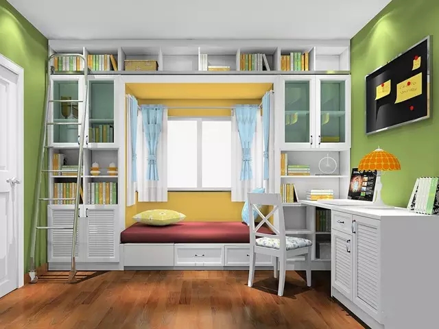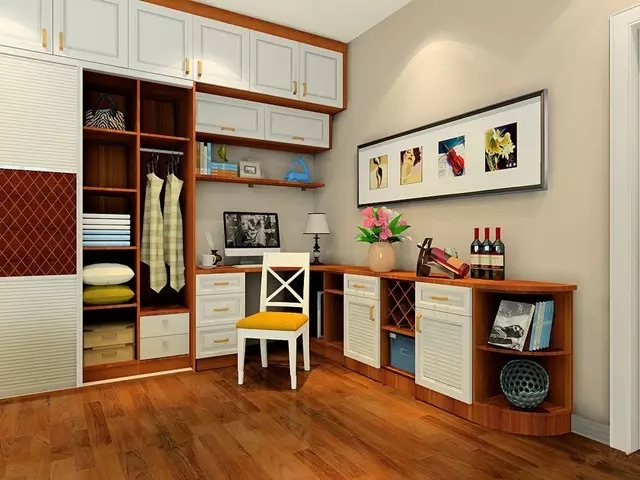①可以將衣柜與書柜一體化設(shè)計(jì),書桌空間往上延伸可利用隔板解決零碎物品的收納和陳列問題。