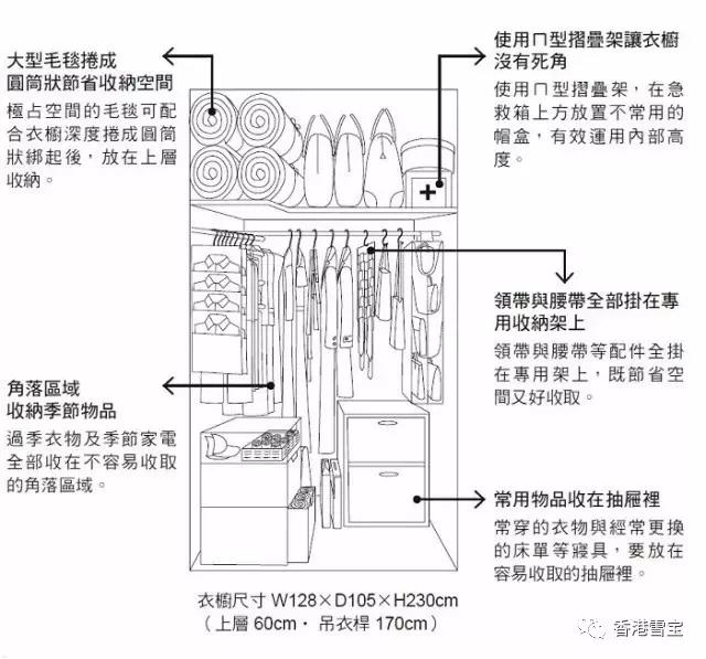 由于上層不容易收取,因此擺放過(guò)季或者不常用的物品。將使用頻率較低的物品往內(nèi)部收納是訣竅。