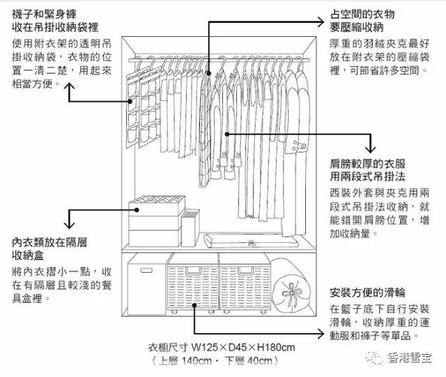 使用附衣架的透明吊掛收納袋,衣物的位置一清二楚,用起來(lái)相當(dāng)方便。